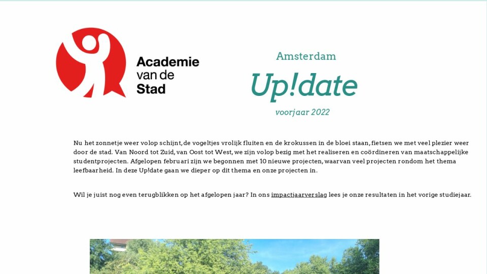 Nu het zonnetje weer volop schijnt, de vogeltjes vrolijk fluiten en de krokussen in de bloei staan, fietsen we met veel plezier weer door de stad. Van Noord tot Zuid, van Oost tot West, we zijn volop bezig met het realiseren en coördineren van maatschappelijke studentprojecten. Afgelopen februari zijn we begonnen met 10 nieuwe projecten, waarvan veel projecten rondom het thema leefbaarheid. In deze Up!date gaan we dieper op dit thema en onze projecten in.
