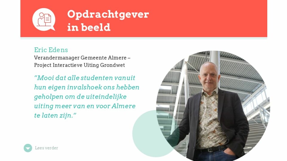 Opdrachtgever Eric Edens geeft aan: “Voor het realiseren van een uiting over de Grondwet heeft de gemeente Almere de afgelopen periode door een studentengroep Bedrijfskunde en een minorgroep Management & Consultancy laten uitzoeken of bij onze inwoners behoefte is om meer te weten over de grondrechten en is geadviseerd om een moderne, interactieve uiting te realiseren. Het afgelopen half jaar heeft een studentengroep communicatie geadviseerd over in te zetten communicatieacties en wordt nu door een derde studentengroep gewerkt aan het binnenhalen van subsidies, zodat er nog meer mogelijk is. Mooi dat alle studenten vanuit hun eigen invalshoek ons hebben geholpen om de uiteindelijke uiting meer van en voor Almere te laten zijn. Studenten in the lead en samenwerken op basis van gelijkwaardigheid? Bij de gemeente Almere kan het.”